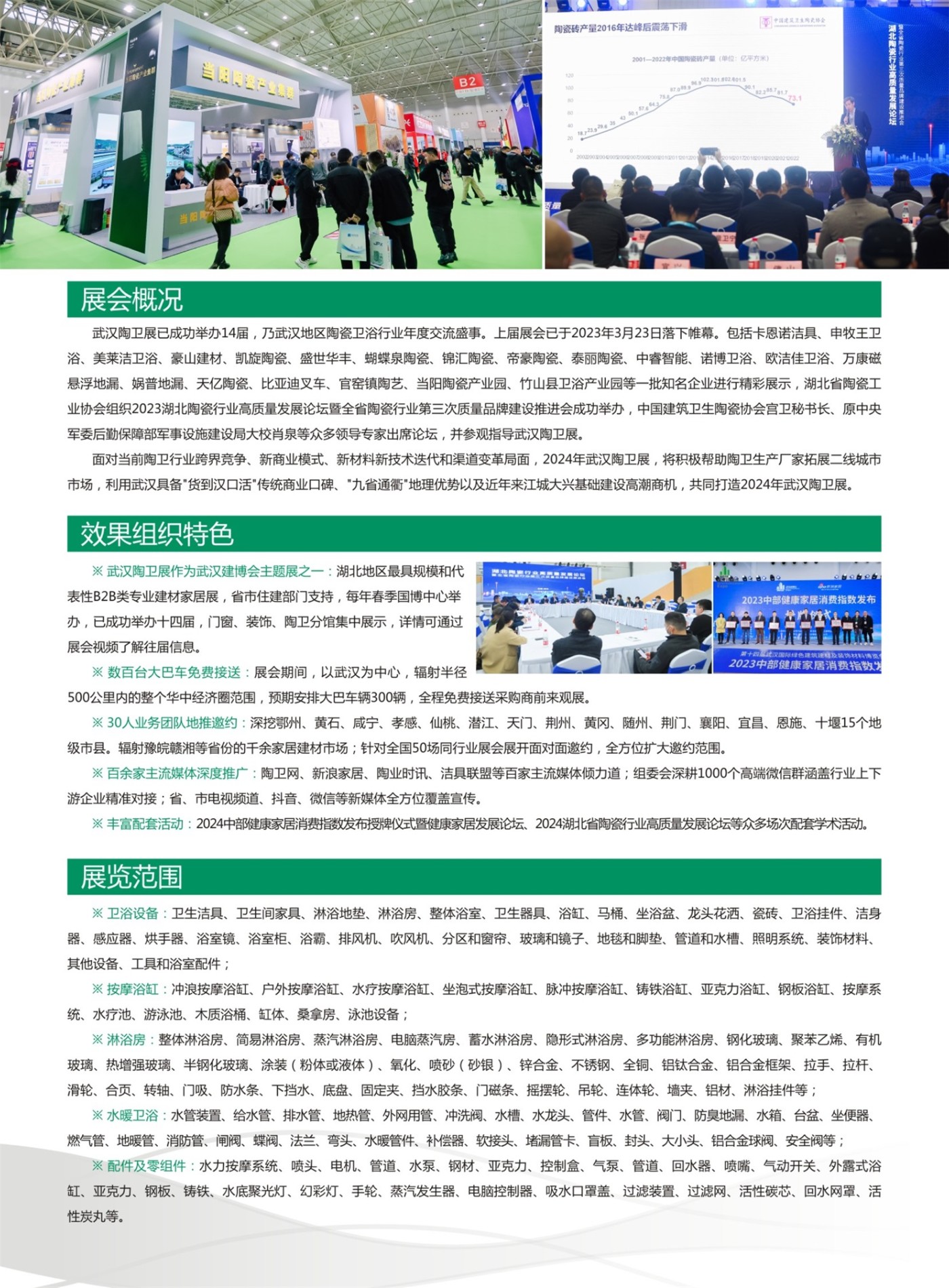 面对当前陶卫行业跨界竞争、新商业模式、新材料新技术迭代和渠道变革局面,2024年武汉陶卫展,将积极帮助陶卫生产厂家拓展二线城市市场,利用武汉具备“货到汉口活”传统商业口碑、“九省通衢”地理优势以及近年来江城大兴基础建设高潮商机,共同打造2024年武汉陶卫展。